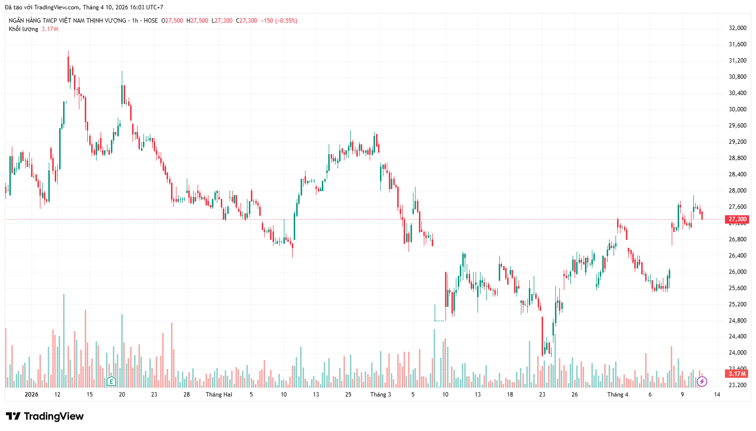Kết thúc phiên giao dịch ngày 10/4, giá cổ phiếu VPB ở mức 27.300 đồng/cổ phiếu, giảm khoảng 3,4% so với đầu năm.