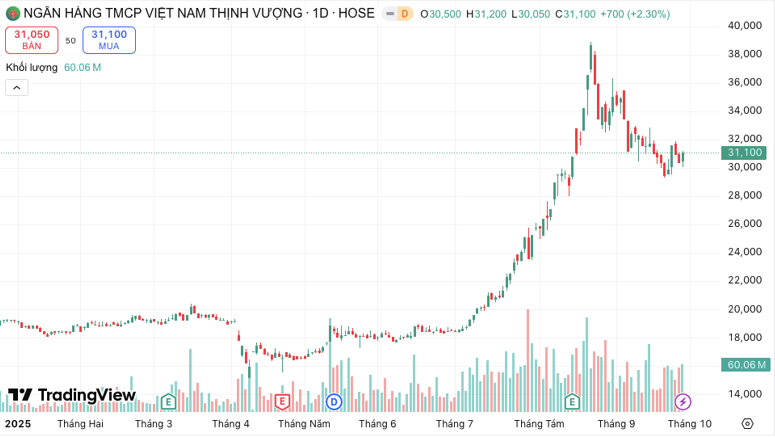 Chốt phiên giao dịch ngày 29/9, cổ phiếu VPBank 31.100 đồng/cp, tăng 2,30% so với phiên cuối tuần trước với khối lượng giao dịch hơn 33,075 triệu đơn vị.