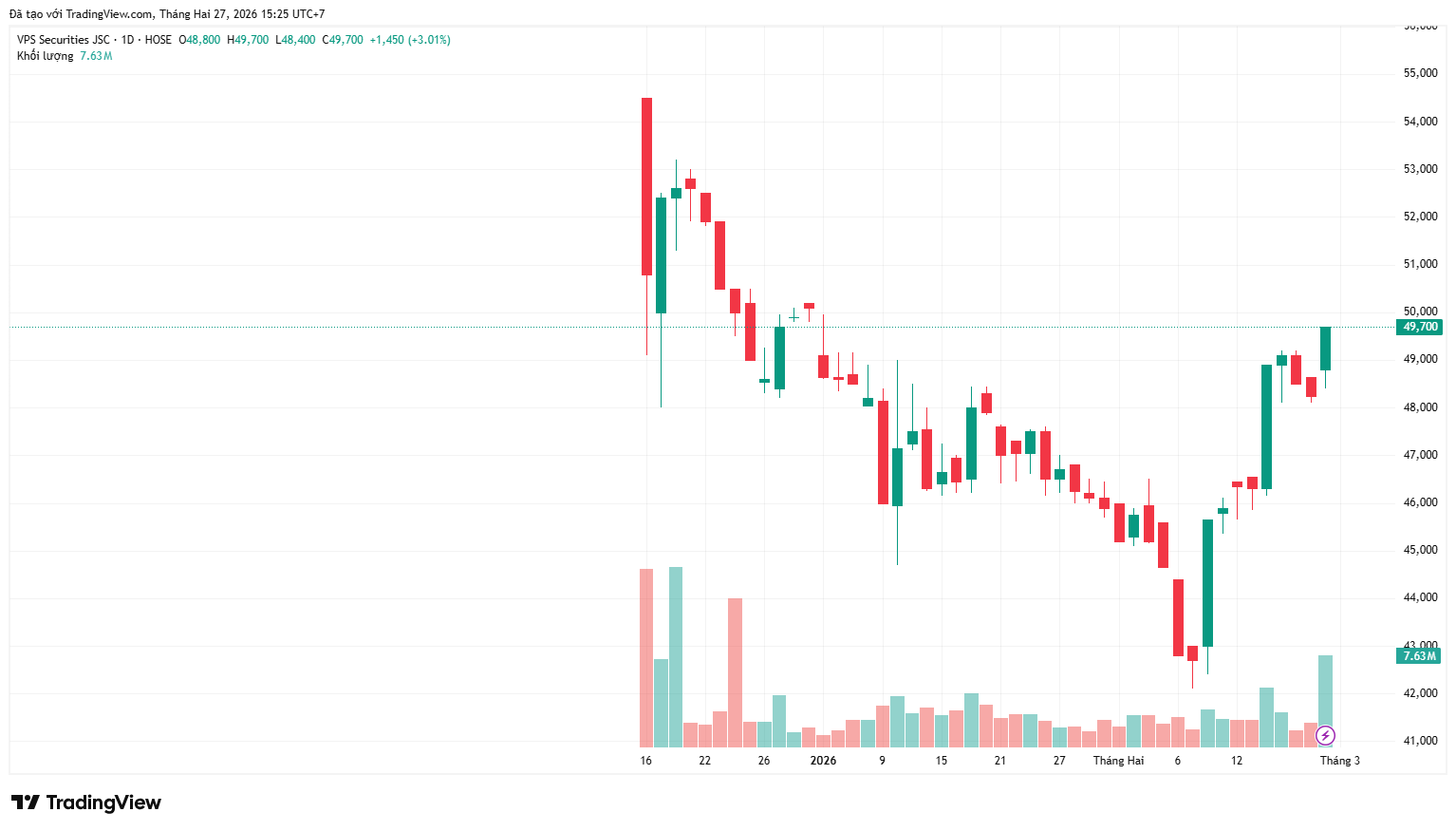 Kết thúc phiên giao dịch ngày 27/02, cổ phiếu VCK ở mức 49.700 đồng/cổ phiếu, tăng khoảng 3% so với phiên liền trước. Hiện vốn hóa thị trường của Chứng khoán VPS đạt hơn 75.634 tỷ đồng.