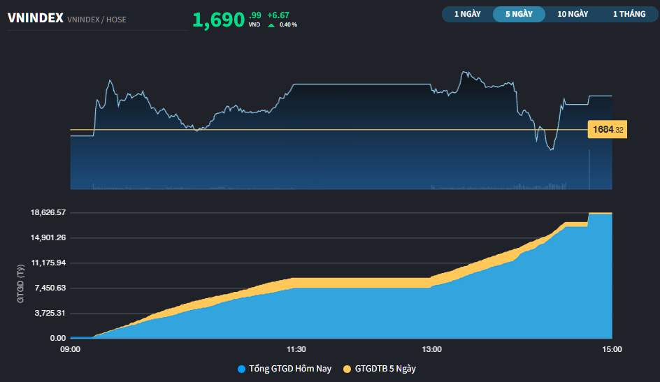 Chỉ số VN-Index tăng 0,4% lên 1.690,99 điểm. Tổng khối lượng giao dịch sàn đạt 707,21 triệu đơn vị, tương đương 20.749 tỷ đồng.