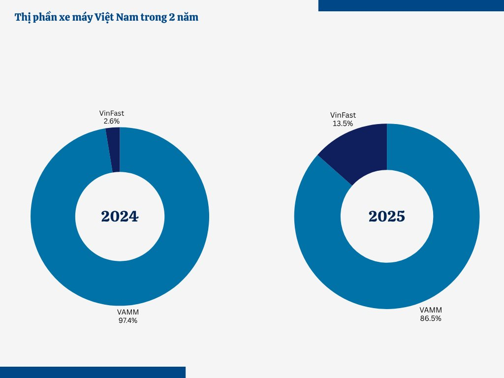 Trái ngược với đà tăng của xe điện, tổng doanh số bán xe máy xăng năm 2025 của 5 hãng thành viên VAMM đạt khoảng 2,61 triệu xe, giảm khoảng 1,5% so với năm 2024 (2,65 triệu xe).