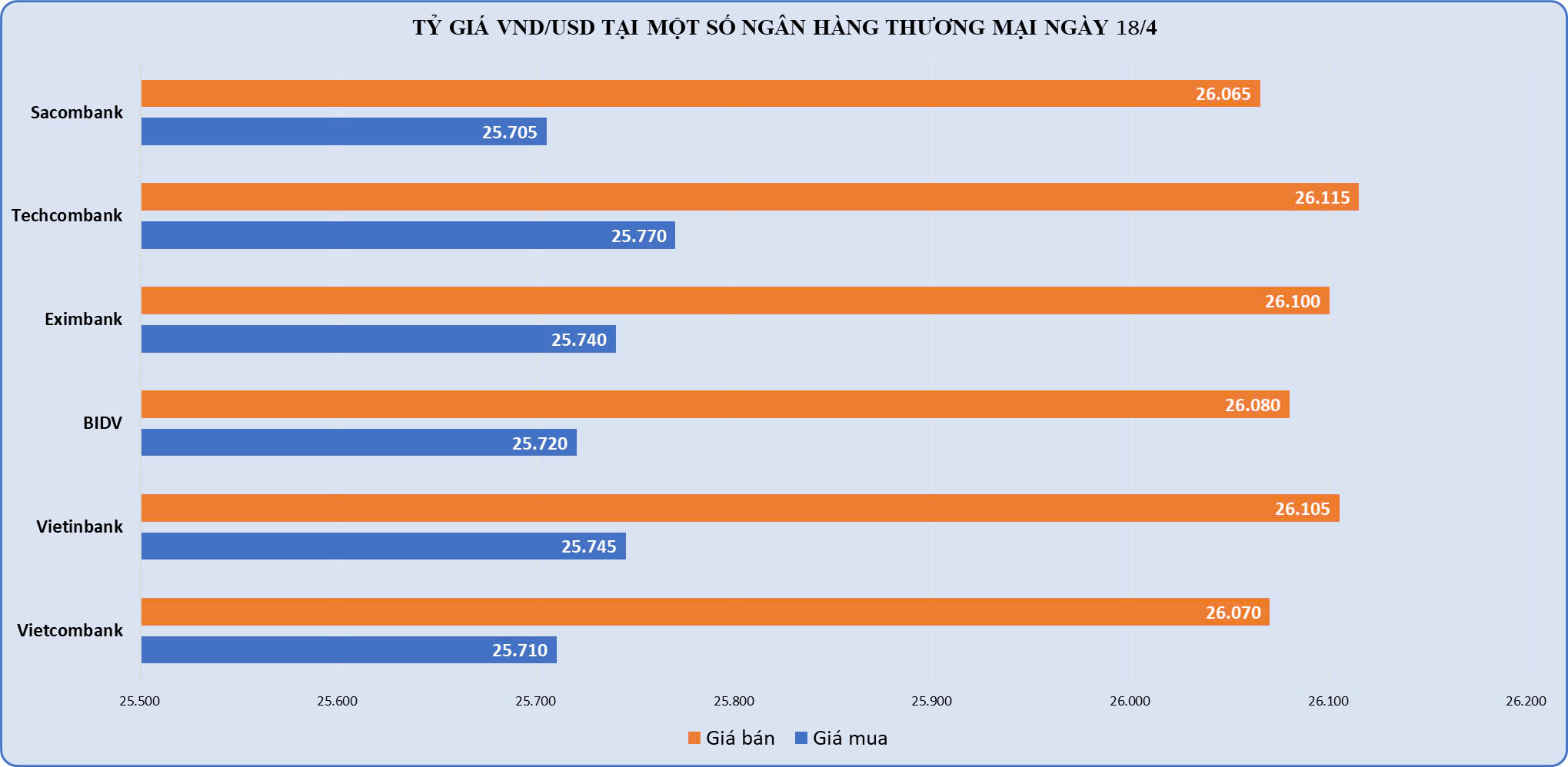 Trên thị trường liên ngân hàng, tỷ giá chốt phiên với mức 25.895 VND/USD, tăng 50 đồng so với phiên 16/4. Tỷ giá trên thị trường tự do tăng 80 đồng ở chiều mua vào và 70 đồng ở chiều bán ra, giao dịch tại 26.090 VND/USD và 26.190 VND/USD.