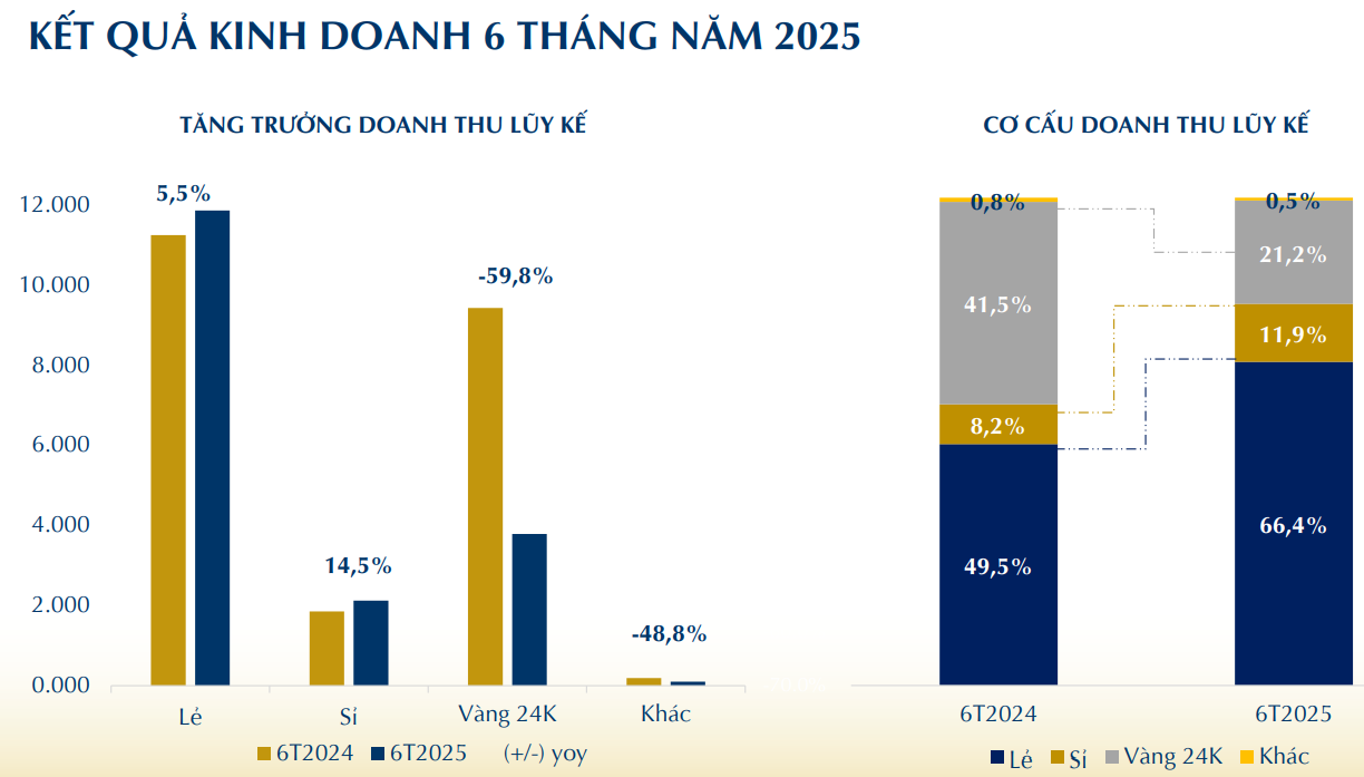 Thực tế, theo báo cáo kết quả kinh doanh của PNJ, mảng bán lẻ đang đóng góp lớn vào tỷ trọng doanh thu thu của doanh nghiệp. 6 tháng đầu năm nay, mặc dù sức mua thị trường trang sức yếu do giá vàng tăng cao, nhưng doanh thu bán lẻ của PNJ vẫn tăng trưởng 5,5% so với cùng kỳ, đạt 11.433 tỷ đồng. Mảng trang sức bán sỉ 6 tháng đầu năm cũng tăng trưởng 14,5% so với cùng kỳ, đạt 2.049 tỷ đồng.