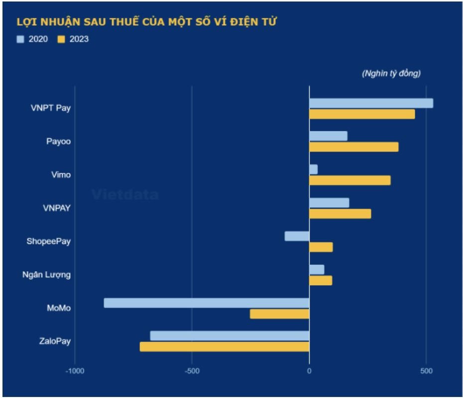 Tình hình doanh thu của thị trường ví điện tử thể hiện sự phân hóa rất rõ rệt, chủ yếu do nhu cầu người sử dụng dịch vụ. Zalo, Vimo, VNPAY thể hiện mức tăng trưởng ấn tượng trong giai đoạn 2020-2023. Lợi nhuận sau thuế phân hóa theo thị phần trong đó nhóm ví điện tử chiếm thị phần cao thì lợi nhuận sau thuế luôn âm hoặc cực kỳ thấp.